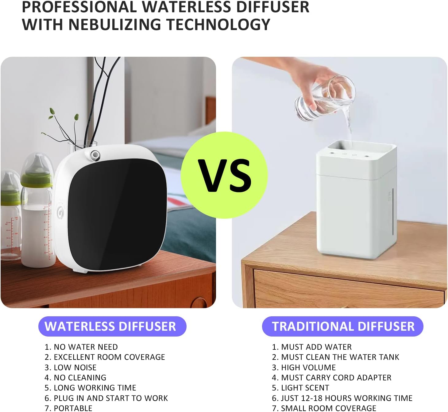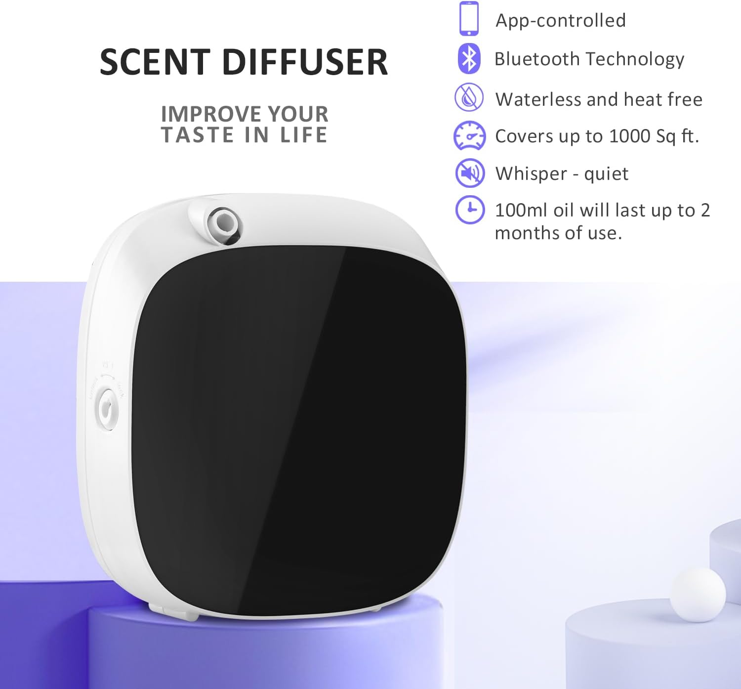 - 【COLD-AIR DIFFUSION TECHNOLOGY】: This waterless aromatherapy diffuser adopts the Cold-Air Diffusion Technology which takes the high-quality fragrance oil micro-droplets to everywhere in your home without any heat or water. Our Scent machine is very ECONOMIC, spending less than 0.5ml/h when you choose the highest grade.